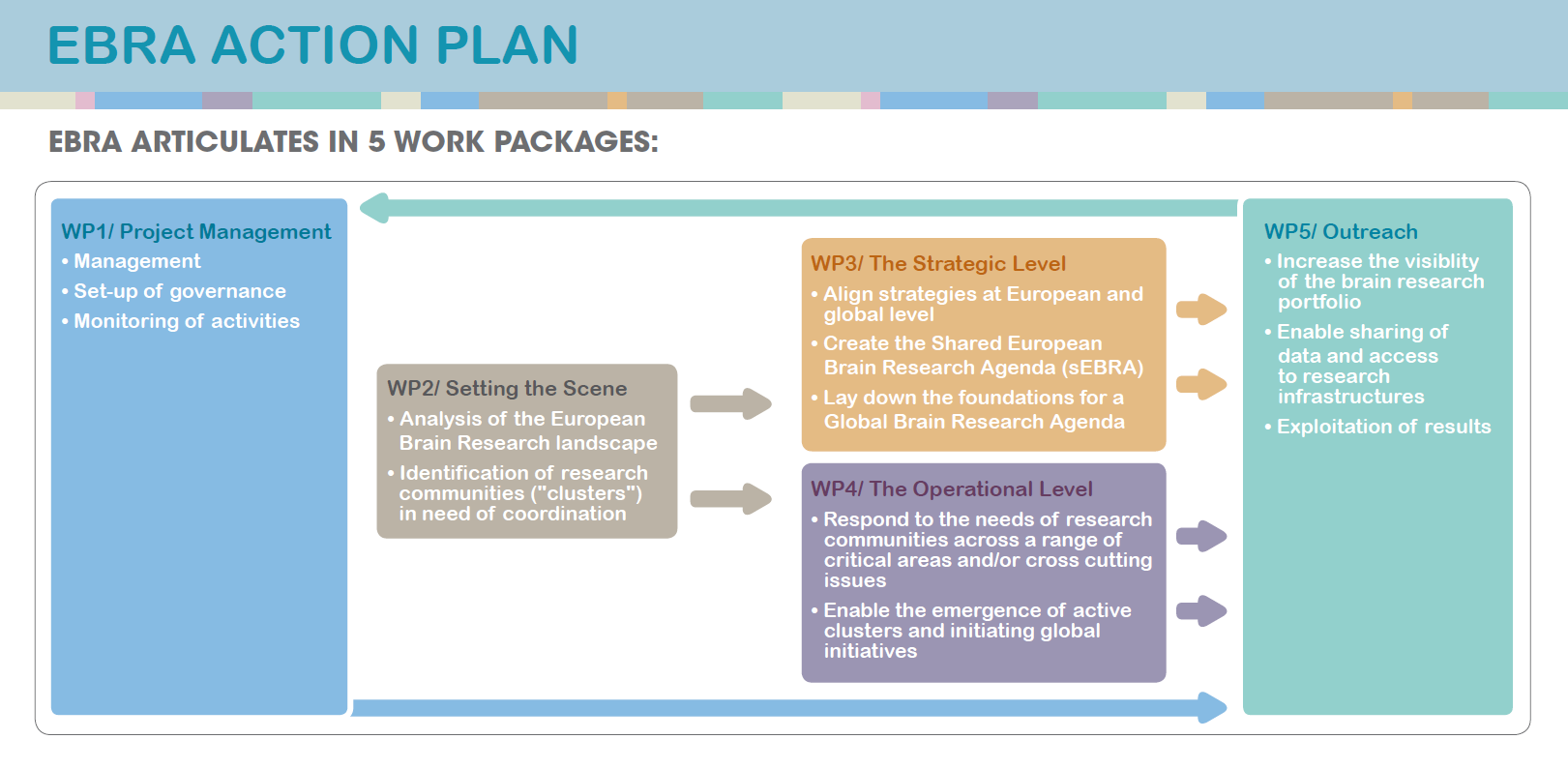 EBRA builds on 5 work packages. WP1 and WP5 cover transverse activities, namely: project management (WP1) and dissemination, outreach and patient involvement (WP5). The other work packages will focus on mapping the existing European brain research landscape (WP2) which will then be used as a basis for the development of a shared European brain research agenda (SEBRA; WP3). In WP4, the various stakeholders and major brain research initiatives, at European level and beyond, will come together and create the conditions for real and effective cross fertilisation, dialogue, building consensus.