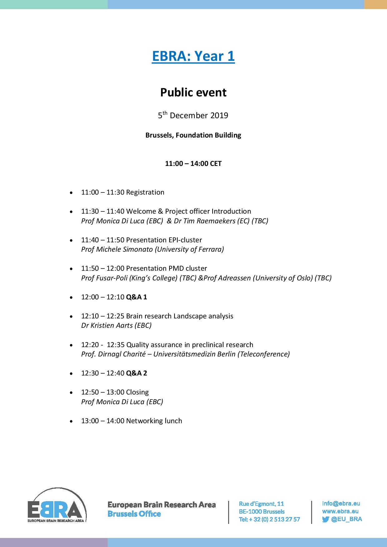One year into the EU-funded EBRA (European Brain Research Area) project, the European Brain Council and partners Human Brain Project, JPND and ERA-NET NEURON, cordially invite you to the first project event on 5 December 2019.